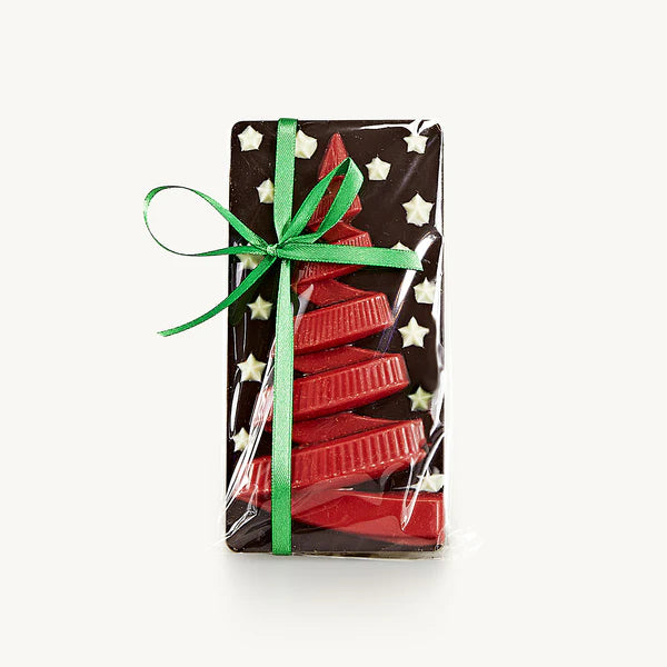 La nostra tavoletta di cioccolato al latte natalizia è realizzata artigianalmente con cioccolato finissimo e decorata con un elegante albero di Natale in cioccolato, lavorato a mano dai nostri maestri cioccolatieri.