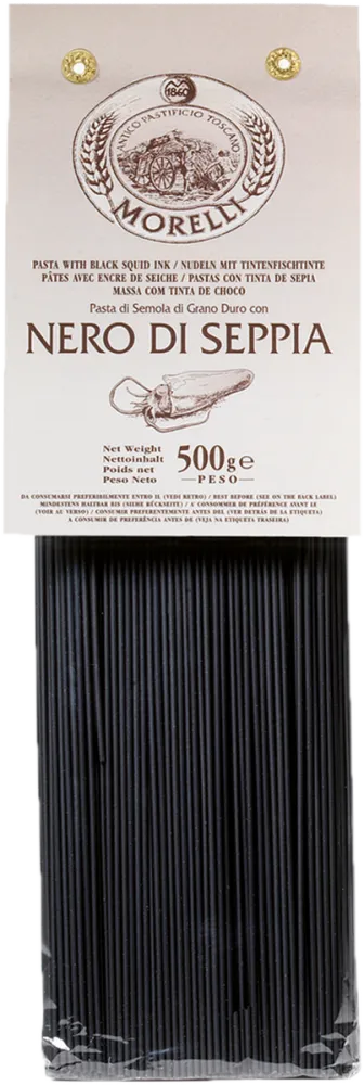 Prodotto caratterizzato dal sapore di pesce e dalla colorazione di un nero molto intenso dato dalla Seppia, che rimane anche dopo la cottura, senza rilasciare residui nell’acqua. Ideale con salse di pesce e mischiabili in percentuale variabile con i nostri Spaghetti di semola della stessa cottura (8 minuti), per un piatto più colorato e ricco di sapore!